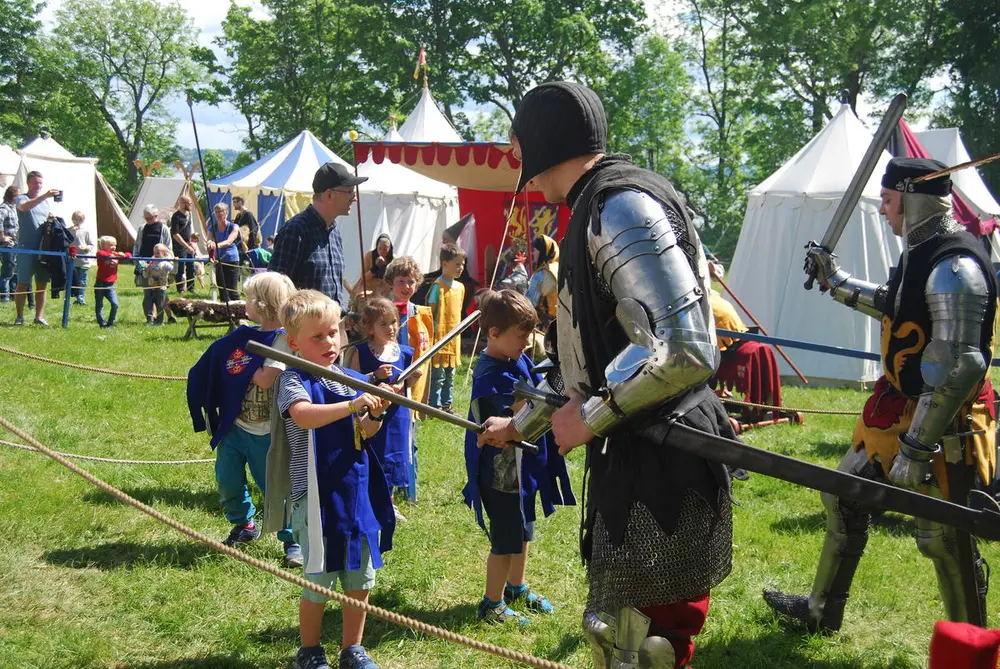Fekteskolen foregår på ridderskolearenaen. Deltakerne får en kort innføring i bruk av sverd på middelaldervis av kongens riddere. Deretter vil lederen for fekteskolen la dem få øve seg mot hverandre. For deltakernes sikkerhet brukes latekssverd med myke kanter, men som i bruk kjennes ut som ekte sverd.