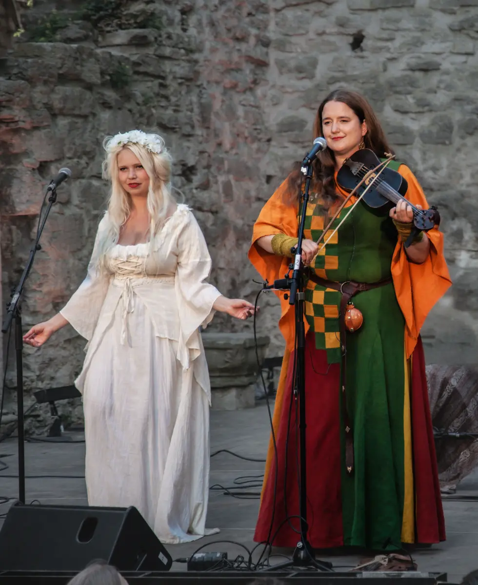 Starur og Fornfela har sunget sammen i ti år i ulike konstellasjoner og med ulike tema. De møttes på Medeltidsveckan i Visby. To sangere, den ene med en harpe og den andre med en fiddle.